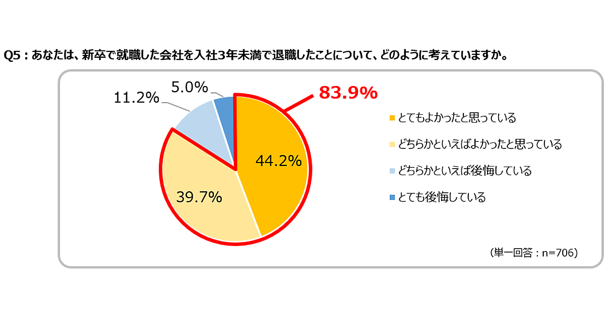 新卒で就職した会社を3年未満で退職したことについてどう思っているかを聞くと、「とてもよかった」が44.2%、「どちらかといえばよかった」が39.7%で、合計すると83.9%の人が退職したことをポジティブに捉えていることがわかった。