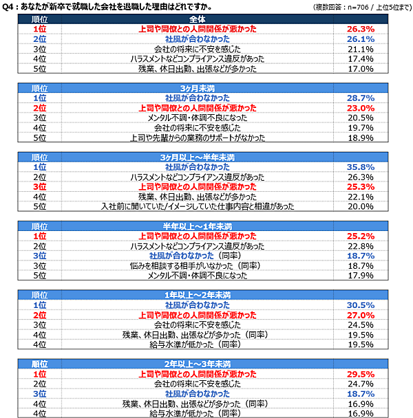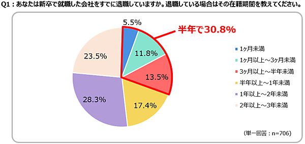 スタッフサービス・ホールディングスは「新卒3年未満で正社員を退職した若年層の意識調査」を実施した。新卒で就職した会社を3年未満で退職した経験のある706人が回答している。