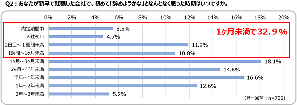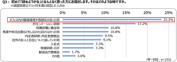 初めて「辞めようかな」と思った時期を聞くと、「1カ月未満」が合計で32.9%にのぼった。また、どのような場面で「辞めようかな」と思ったかを聞くと、「オフィス内の職場環境や雰囲気を知った時」が23.3%で最も多く、ついで「オリエンテーション・研修」が17.2%となった。