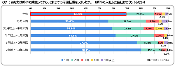 続いて、これまでの転職回数を聞いたところ、全体では69.3%が「1回」と回答。在籍期間別で見ると、「2年以上~3年未満」では「2回以上」が19.9%だったのに対し、「3ヶ月未満」では43.3%と大きな差が見られた。