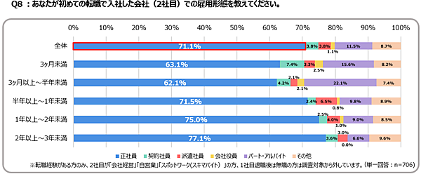 転職で入社した2社目の会社での雇用形態を聞くと、全体では71.1%が「正社員」と回答。在籍期間別で見ると、「2年以上~3年未満」が2社目も正社員として働いている割合が最も高く、「半年未満」では「パート・アルバイト」の割合が高い傾向が見られた。
