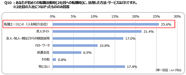 初めての転職活動時に活用したサービスとしては、「転職エージェント」が25.6%で最も多く、ついで「求人サイト」が21.4%となった。