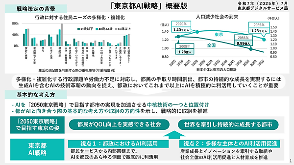 行政課題や労働力不足への対応、都民の「手取り時間」創出などには、これまで以上にAIの利活用が重要、と考えた。2050東京戦略で目指す姿は、都民がQOL(生活の質)向上を実感できる社会と、世界をけん引し持続的に成長する都市。東京都AI戦略ではこの実現に向け①都政でのAI利活用②多様な主体とのAI利活用促進--の視点を掲げた。