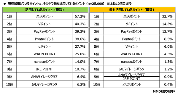 まず、事前調査の25,000人を対象に「現在活用している共通ポイント」を聞くと、「楽天ポイント」が57.2%と最も多く、ついで「Vポイント」が40.3%、「PayPayポイント」が39.3%となった。その中で「最も活用している共通ポイント」としては、「楽天ポイント」が32.7%、「dポイント」が14.3%、「PayPayポイント」が13.7%で上位となった。