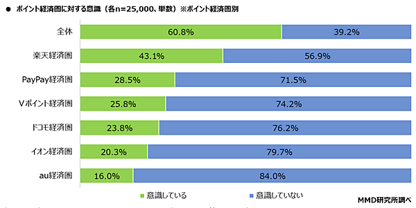 「ポイント経済圏を意識しているか」という質問では、全体の60.8%が「意識している」と回答。ポイント経済圏別でみると、特に「楽天経済圏」において意識の高さがうかがえた。