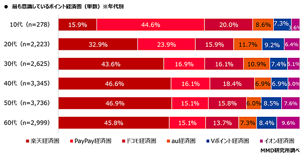 ポイント経済圏を意識している15,206人に対し、最も意識している経済圏を聞いたところ、最多は「楽天経済圏」で43.5%、ついで「PayPay経済圏」が17.5%、「ドコモ経済圏」が16.1%となった。年代別でみると、30~60代では半数近くが「楽天経済圏」を選んだのに対し、10代では「PayPay経済圏」が44.6%と圧倒的だった。