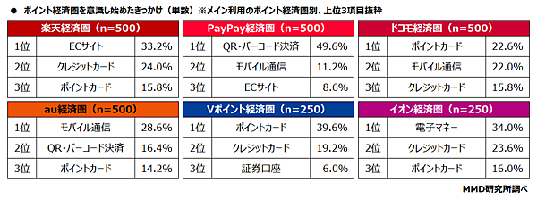 本調査の2,500人に対し、ポイント経済圏を意識し始めたきっかけを聞くと、楽天経済圏では「ECサイト」、PayPay経済圏では「QR・バーコード決済」、ドコモ経済圏とVポイント経済圏では「ポイントカード」、au経済圏では「モバイル通信」、イオン経済圏では「電子マネー」がそれぞれトップになった。