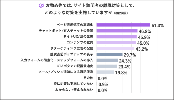 「サイト訪問者の離脱対策として実施しているもの」を聞くと、「ページ表示速度の高速化」61.3%がもっとも多く、「チャットボット/友人チャットの設置」「サイトUX/UIの改善」「コンテンツ拡充」が45%前後で続く。基本的には利便性・内容よりUI/UXの快適さが重視されているといえる。