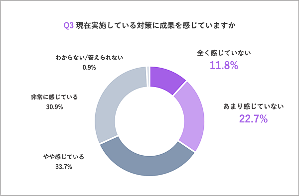 一方「現在実施している対策に、成果を感じているか」という質問に対しては、34.5%が「成果を感じていない」と回答。感じていないという人たちに理由を聞くと「実施施策がターゲットユーザーに合っていない」52.6%、「離脱の原因が特定できていない」39.5%、「離脱後の再アプローチの仕組みが弱い」39.5%が上位だった。