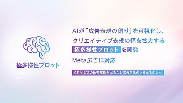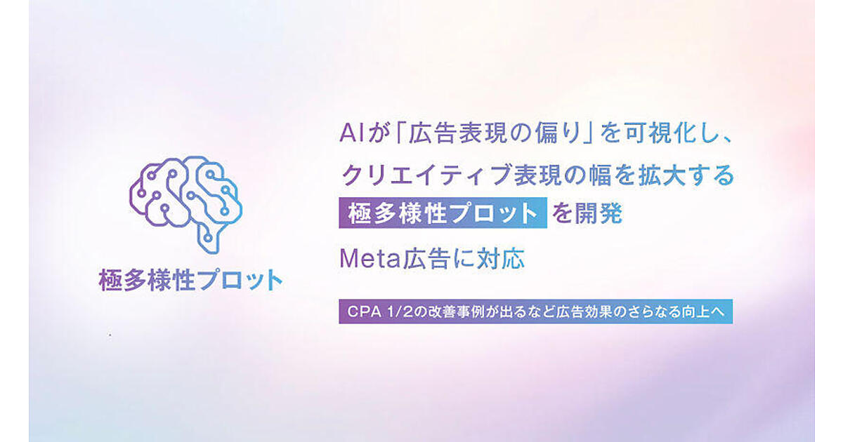 サイバーエージェントは、AI技術を活用して配信中の広告クリエイティブの「偏り」を可視化する新機能「極多様性(キワミタヨウセイ)プロット」をAI事業本部が開発し、「Meta広告」への対応を始めたと7月29日に発表した。広告クリエイティブの表現傾向や多様性を把握するツールで表現の偏りを可視化し、まだアプローチできていない潜在層へ向けた新たな広告クリエイティブ表現を見つける羅針盤となる。特許を出願している。