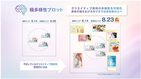 例えば、「若年層向け」や「価格訴求」など特定の切り口に偏って配信されている傾向を可視化し、「中高年層向け」や「品質訴求」などこれまで試してこなかった訴求手法の発見を促して、より多様なクリエイティブ制作を可能にする。同社の「極予測(キワミヨソク)AI」と組み合わせることによって、より幅広いユーザーと訴求表現のバリエーションを持つ広告制作が可能になり、広告効果のさらなる向上が期待できる。