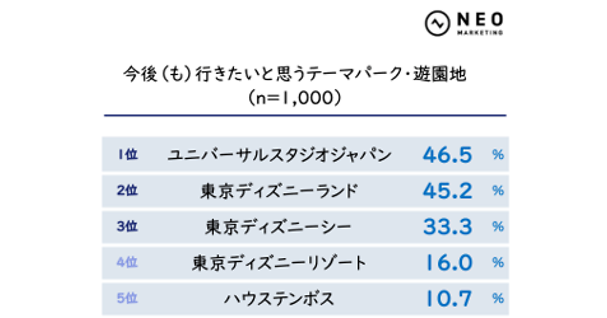 まず、行きたいテーマパーク・遊園地を自由回答で聞いたところ、「ユニバーサル・スタジオ・ジャパン」が46.5%でトップに。2位は「東京ディズニーランド」で45.2%、3位は「東京ディズニーシー」で33.3%となった。地方では「ハウステンボス」や「富士急ハイランド」も健闘している。