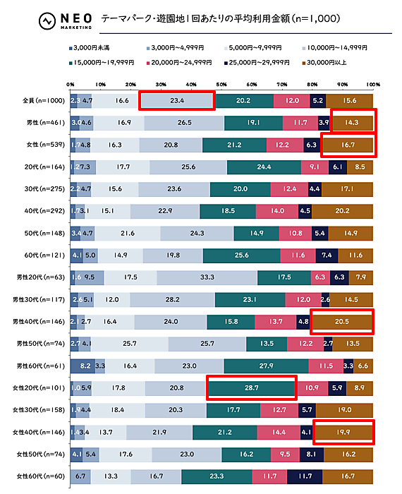 テーマパーク1回あたりの平均利用金額を聞くと、全体では「10,000~14,999円」が23.4%、「15,000~19,999円」が20.2%となり、1万円台の支出が主流であることがわかった。男女別で見ると、「30,000円以上」の高額帯は男性よりも女性の方がやや高い結果に。また、40代では男女ともに高額消費が目立った。