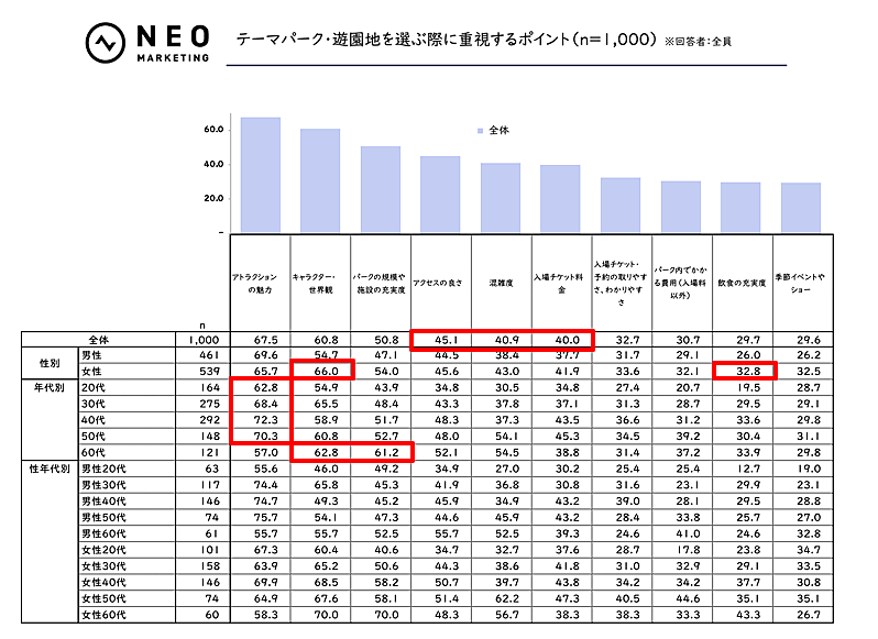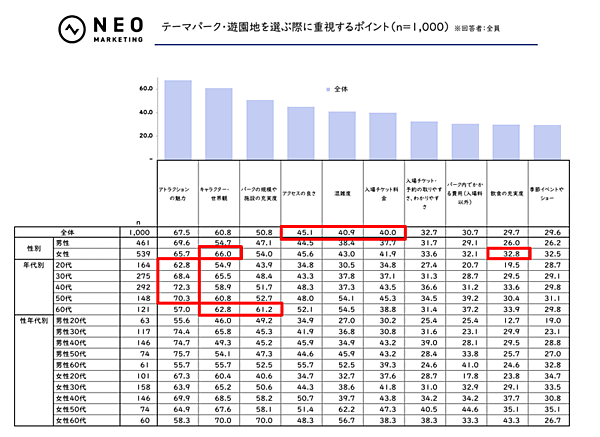 男女別で見ると、女性は「キャラクター・世界観」(66.0%)や「飲食の充実度」(32.8%)を重視する傾向が強く、男性は「アトラクションの魅力」(69.6%)をより重視していた。
