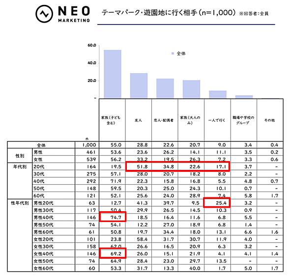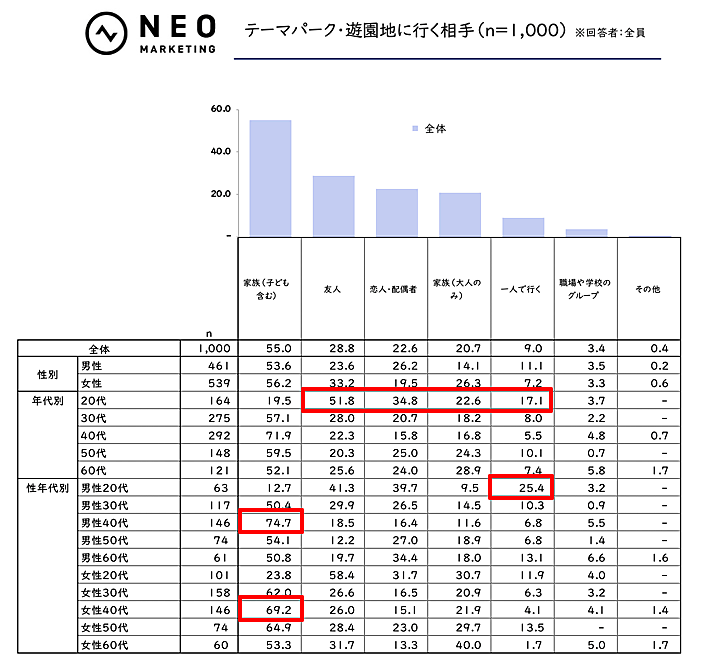 テーマパークに一緒に行く相手としては、全体では「家族(子ども含む)」が55.0%で最も多かった。特に40代では、男性74.7%、女性69.2%と突出している。