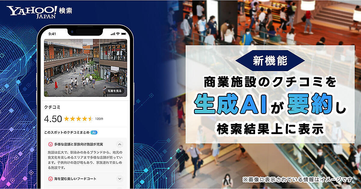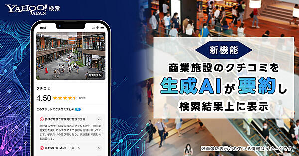 LINEヤフーは、検索サービス「Yahoo!検索」で全国約4万7000カ所のショッピングモールや小売店、百貨店などの商業施設を対象に、クチコミ情報を生成AIが自動的に要約し、検索結果上に表示する新機能の提供を始めたと7月31日に発表した。商業施設に関する情報収集をより効率的にする取り組みで、生成AIがクチコミからユーザー体験や施設の高評価なポイント、訪問の際に留意すべき点などを抽出し、最大5つの特徴を表示する。