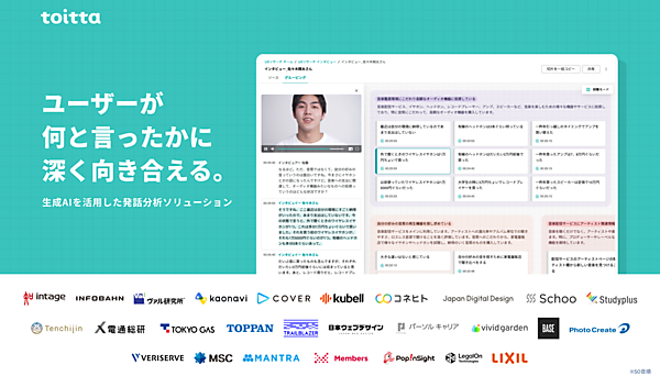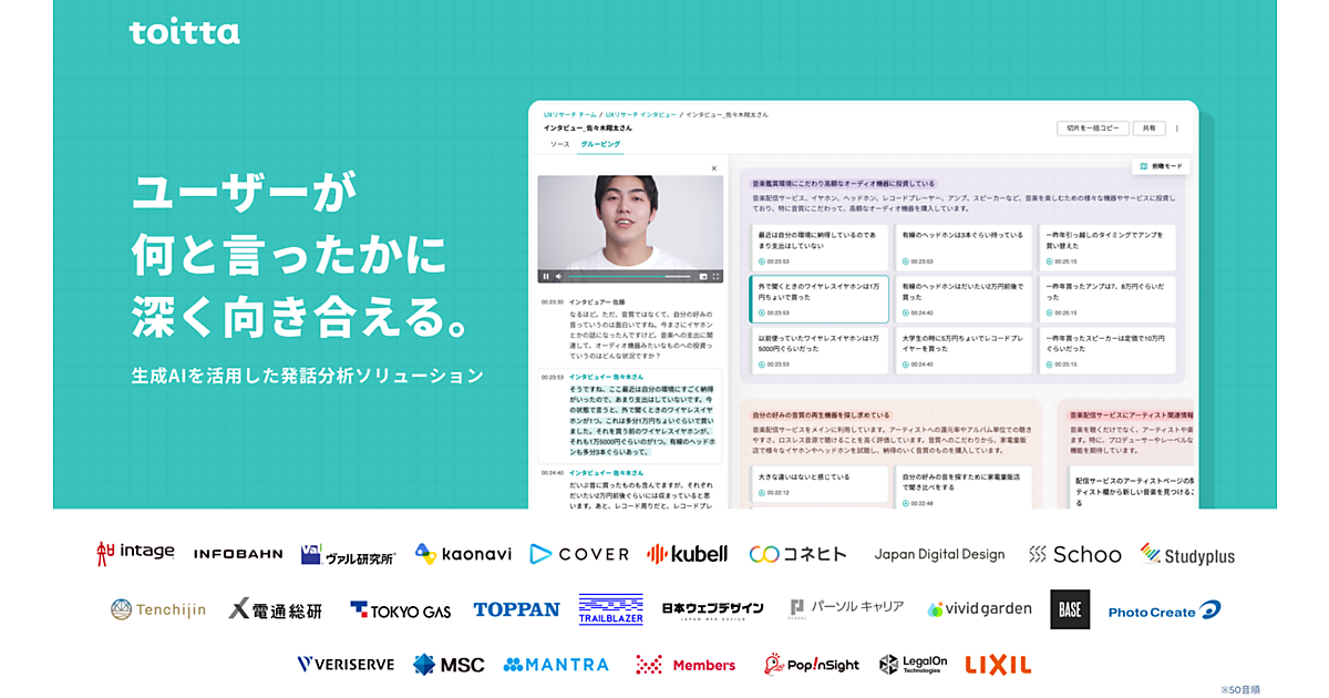 toittaはユーザーのインタビュー動画から「書き起こし」や分析素材の「切片」を自動生成する。ただ高いセキュリティ基準を設けてインタビューデータをAI学習に利用せず、導入企業への定期的なヒアリングで得るフィードバックを参考に機能改善に取り組んできた。長谷川氏はtoitta導入企業でデザイン事業のコンセントの社長を務めており、産学連携でフィードバックを獲得する発展的プロジェクトとして武蔵野美術大学と連携した。
