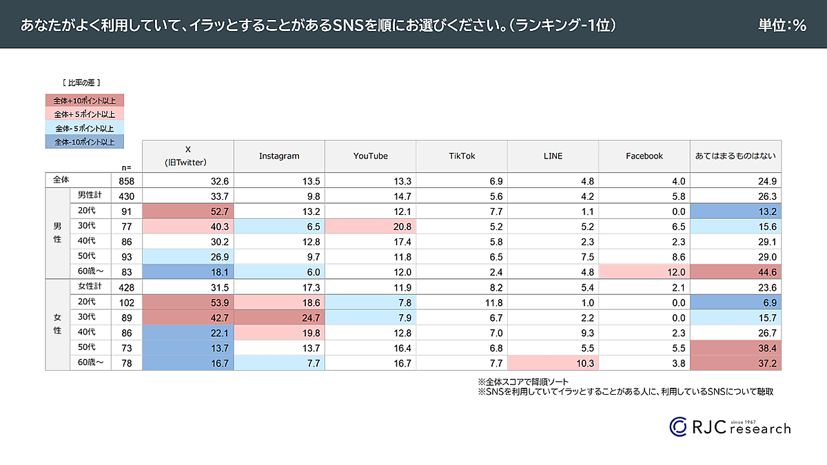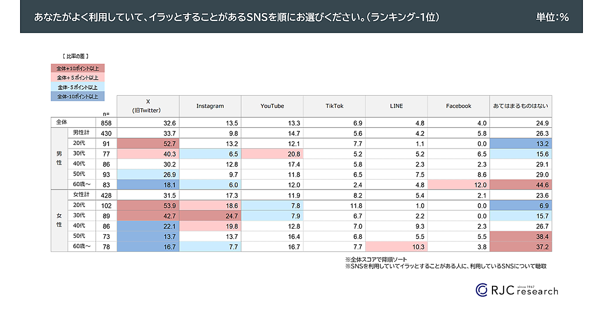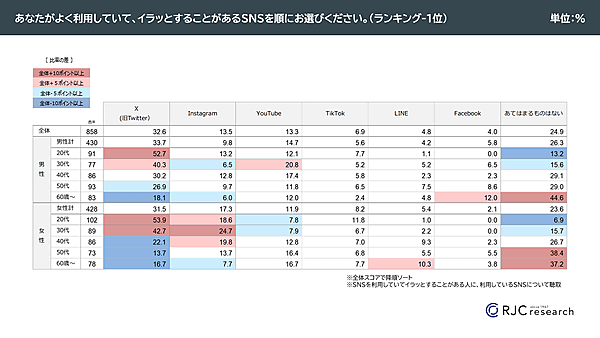 まず「あなたが利用していて、イラッとすることがあるSNS」を集計すると、全体の32.6%が 「X(旧Twitter)」をあげて1位となった。2位「Instagram」は13.5%にとどまっており、Xの不快感が突出していることがわかる。性年代別では、男女とも20~30代の比率が高い。一方2位の 「Instagram」 は、女性20~40代が他年代より比率が高くもポイント数が高い。“インスタ映え”が人によっては反感を呼んでいるのかもしれない。