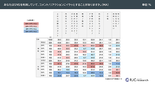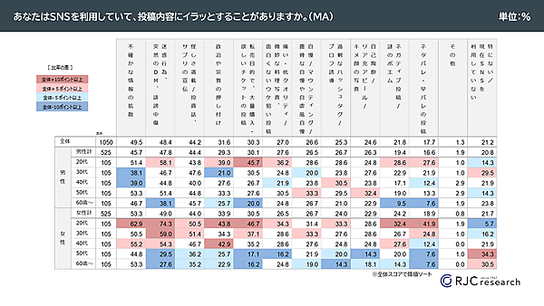 「イラッとする内容」について「投稿内容」と「コメント・リアクション」で分けてそれぞれ聞くと、投稿内容では「不確かな情報(デマやフェイクニュース、ゴシップ)の拡散」49.5%が最多で、コメント・リアクションでは「上から目線のコメント」39.5%がもっとも多かった。性年代別では、男性20代と女性20~30代がイラッとしているケースが多い。
