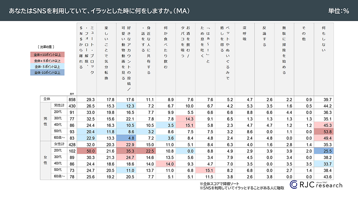 「SNSを利用していて、イラッとしたときの対処では 「ミュート・ブロック・フォロー解除をする、とり合えずSNSから離れる」29.3%が最多で、以下「楽しいことで気分転換」17.8%、「好きなアカウントの投稿/可愛い動物動画を見る」17.6%がそれに続いた。男女別では女性は「好きなアカウントの投稿/可愛い動物動画を見る」が35.3%と大幅増で2位になり、「身近な人に共有する・話をする」22.5%が3位となった。