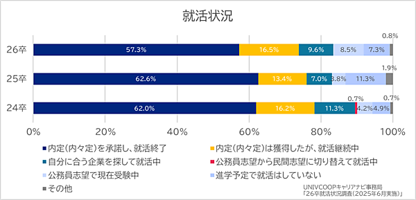 まず、現在の就活状況を聞くと、26卒では「内定(内々定)を承諾し、就活終了」の割合がやや減少した。一方で、「内定(内々定)は獲得したが、就活継続中」や「自分に合う企業を探して就活中」は増加しており、全体の約4分の1にのぼった。進路選択に慎重な傾向が見られ、就活の長期化がうかがえる。