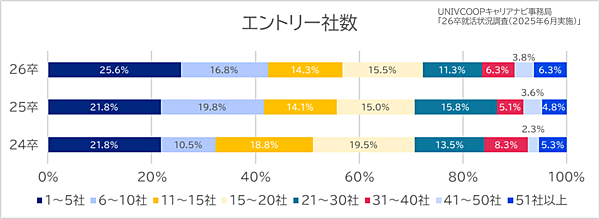 エントリー社数は「1~5社」が25.6%で過去最高に。一方で、「31社以上」の多数エントリーも増加しており、「20~30社」の中間層が減少した。この傾向は内定獲得社数にも影響を及ぼしており、最も多かったのは「内定1社」(41.3%)だった。