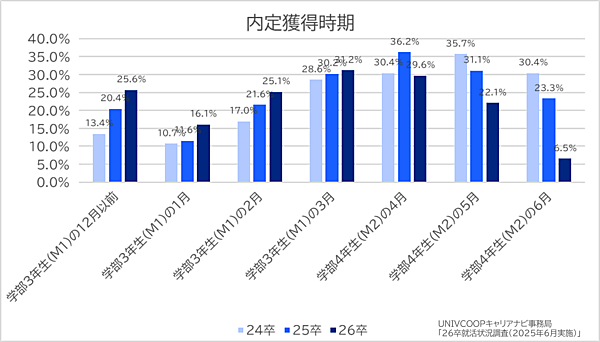 内定獲得時期を聞くと、25卒までは「3~5月」に集中していたが、26卒では「3月」(31.2%)、「4月」(29.6%)についで「12月以前」(25.6%)が3位に。就活の早期化が大きく影響し、“年内の内定獲得”が主流になりつつあることがわかった。