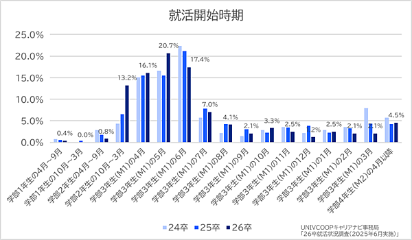 また、就活を開始した時期を聞くと、25卒までは6月スタートが多い傾向だったが、26卒では活動開始のピークが5月とやや前倒しとなった。また、「学部2年生の10月~3月」は13.2%で、昨年比倍増となった。