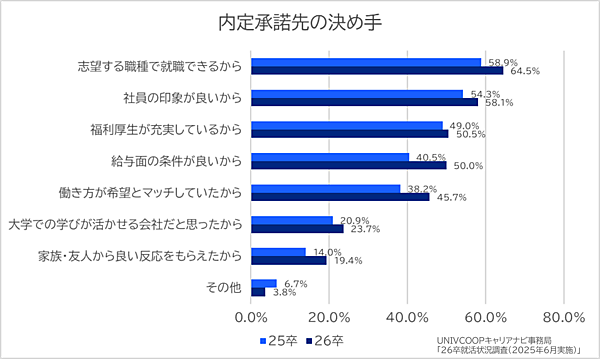 内定承諾の決め手としては、「給与面の条件が良い」が昨年比で9.5ポイント増、「働き方が希望とマッチしていた」が7.5ポイント増と大きく伸長。昨年と同様に、「希望する職種だった」「社員の印象が良い」「福利厚生が充実」といった項目も上位に並んだ。