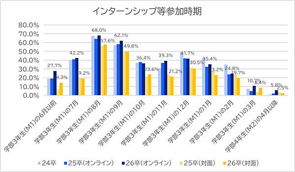 インターンシップの参加時期を聞くと、「学部3年生(M1)の6月以前」がオンライン形式・対面形式ともに増加。対面形式は全体的に減少傾向にあるものの、「学部3年生(M1)の8月・10月」での参加は微増しており、特定時期に集中する傾向が見られた。