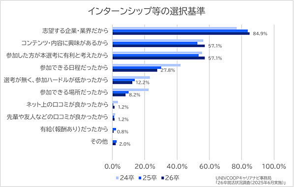 インターンシップを選ぶ基準としては、「コンテンツ・内容に興味があるから」「本選考に有利だと考えたから」といった目的意識のある理由が増加傾向に。一方で、「参加できる日程だったから」「選考がなく参加しやすかったから」といった消極的な理由は年々減少している。
