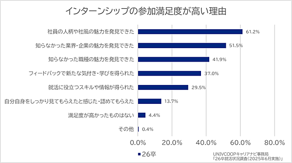 インターンシップの参加満足度が高い理由としては、1位は「社員の人柄や社風の魅力を発見できた」で61.2%。ついで「知らなかった業界・企業の魅力」「知らなかった職種の魅力」と続いており、ネット上の情報からは得られないリアルな気づきが満足度の向上につながることがわかった。