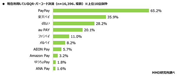QR・バーコード決済は73.6%が「利用している」と回答。利用者16,393人に利用ブランドを聞くと、「PayPay」が65.2%、「楽天ペイ」35.9%、「d払い」28.2%が上位で、これも半年前とほぼ同じ比率だ。
