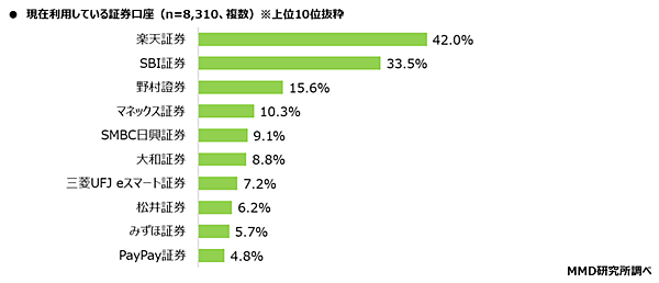 証券会社は33.2%が「利用している」と回答。利用者8,400人を対象に、現在利用している証券会社について聞くと、「楽天証券」42.0%、「SBI証券」33.5%、「野村證券」15.6%が上位だった。2025年上半期は証券会社を騙るフィッシング詐欺が横行したが、利用ブランドについては大きな影響は見られなかった。