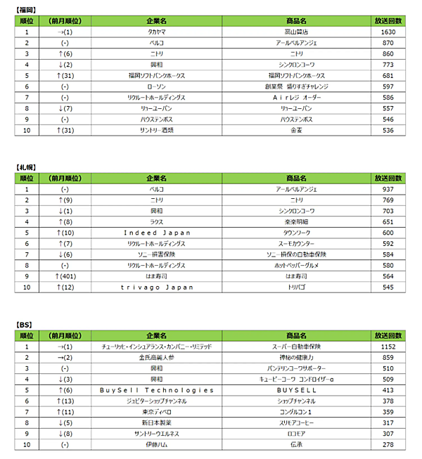 福岡では地元企業タカヤマの「高山質店」が2位と倍近い差をつけてトップに。札幌ではベルコの結婚式場「アールベルアンジェ」が新規で1位を獲得した。BSでは興和の「シンクロンコーワ」、NTTドコモの「ドコモ MAX」が上位に入った。