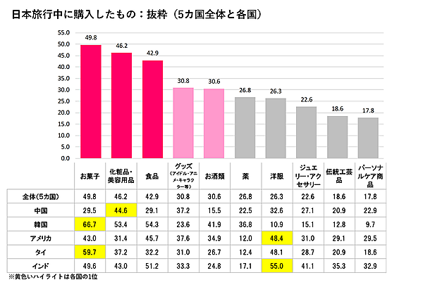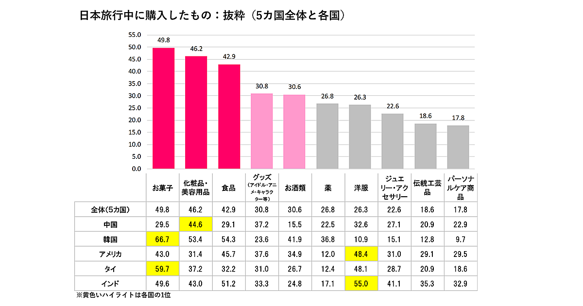 博報堂は、「5カ国インバウンド顧客購買意識調査」を実施した。近年訪日外客数の多い中国・韓国・アメリカ・タイ・インドの各国258人に対し、日本旅行中に購入したものなどを聞いている。