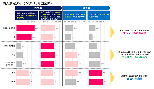 商品の購入を決めたタイミングについて聞くと、「化粧品・美容用品」「薬」は、「旅行前から具体的なブランドや商品を決めていた」という回答が多く見られた。一方で、「家電・電子製品」「洋服」「ジュエリー・アクセサリー」については、「旅行前からそのカテゴリの商品を買うつもりではあったが、ブランドや商品は決めていなかった」という人が多かった。また「食品」「お菓子」は、「店頭で見て、その場で購入を決めた」という回答が最多となった。