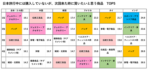 今回は買わなかったが、次回日本に来た時に買いたいと思うものを聞くと、全体ではジュエリー・アクセサリー(18.1%)、バッグ(17.5%)、伝統工芸品(16.4%)が上位となった。また、アメリカではインテリア家具(23.3%)、インドではスポーツアウトドア用品(24.0%)やヘルスケア・フィットネス用品(22.5%)が多く挙げられ、国別に違いも見られた。