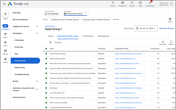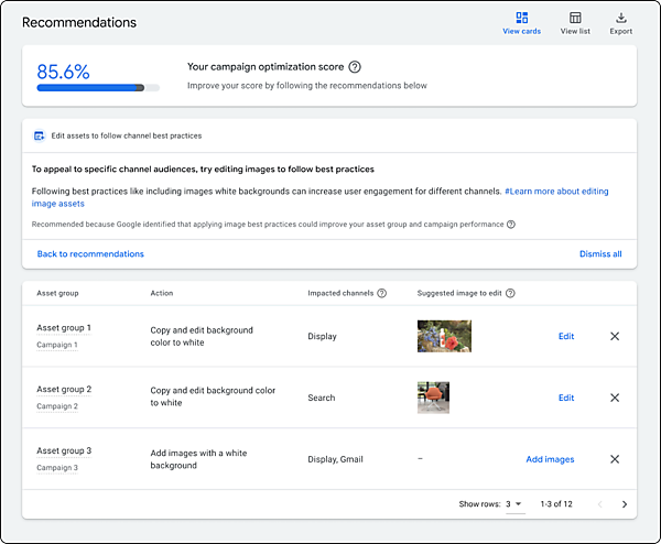 ②は、各キャンペーンに表示する新規顧客の獲得レポートを分かりやすくしたほか、キャンペーンの目標とコンバージョン設定の状況に基づいた新しい診断機能と最適化案を加えた。③は、「最終ページURLの拡張」を使用して配信されるアセット(広告コンテンツ)の管理機能を増強。画像の品質を高めてパフォーマンスを高める最適化案も表示する。