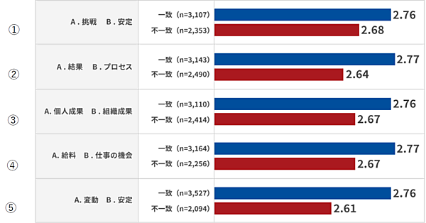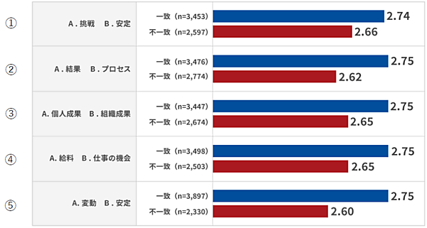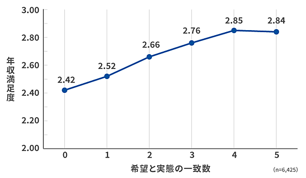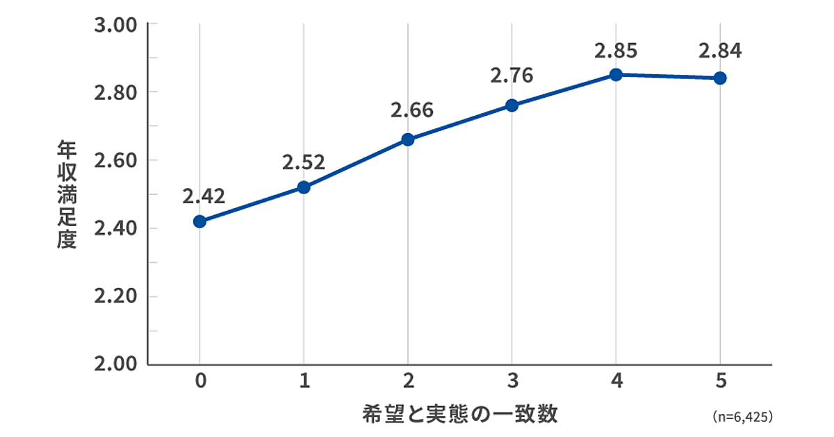 同時に「個人の希望」と「会社の実態」がどの程度一致しているかと、年収満足度との関係を5つの観点で比較すると、「希望」と「実態」が一致している場合、年収への満足度が高い傾向が一貫してみられた。年収への満足度を左右する要因として、「自身がどのような観点で評価されていると感じているか」「職場との相性をどう捉えているか」といった“納得感”の有無が影響しているといえる。