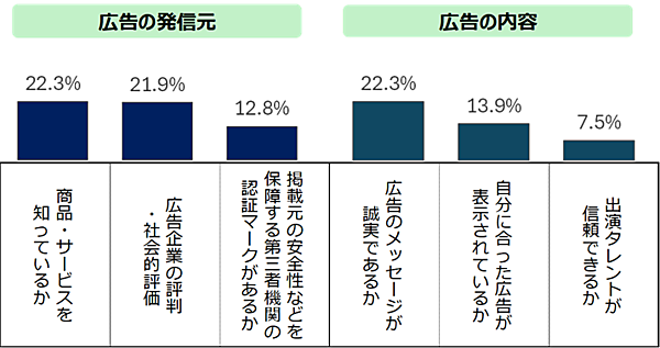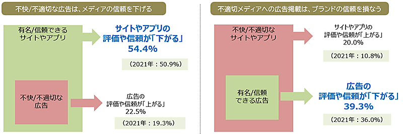また、有名・信頼できる広告であっても、「不快・不適切なサイト・アプリ」に掲載されると、39.3%が「広告への評価や信頼が下がる」と回答。こちらも同様に、2021年調査から3.3ポイントの増加となった。