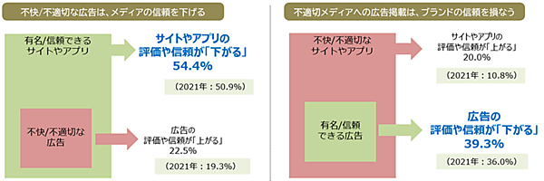一方で、信頼性の高いサイトやアプリであっても、「不快・不適切な広告」が掲載されると、54.4%が「サイトやアプリの評価や信頼が下がる」と回答。これは2021年調査から3.5ポイント増加しており、運営者にとって広告の品質管理が重要性を増していると言える。