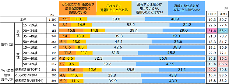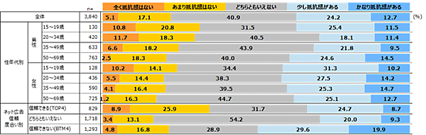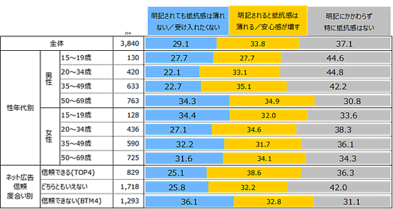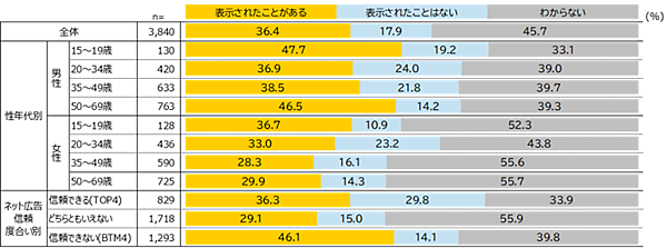 性年代別に見ると、特に男性の15~19歳、50~69歳で表示経験が多い結果に。また、「広告を信頼していない」層では46.1%が「表示経験あり」と回答した。
