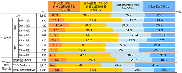 詐欺広告の認知・理解度について見ると、「ある程度知っているが識別自信なし」(39.7%)、「具体的内容は不明」(26.7%)がボリューム層となっており、知識にばらつきがあることがうかがえた。なお、「詳しく知り、識別できる」は10.0%にとどまった。