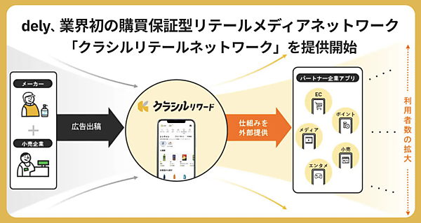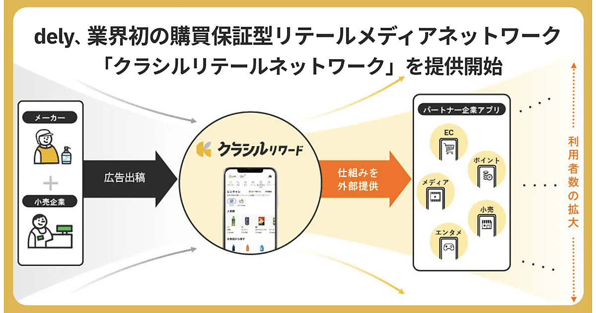delyがメーカー・小売企業といった出稿主から販促案件を受託し、複数のパートナーの消費者向けアプリに対して横断的に配信する購買保証型のリテールメディアネットワークサービス。クラシルリワードの仕組みを外部提供する形となる。出稿主は媒体ごとの調整・契約・管理など運用の負担が軽減でき、複数アプリを通して生活者にアプローチできる。