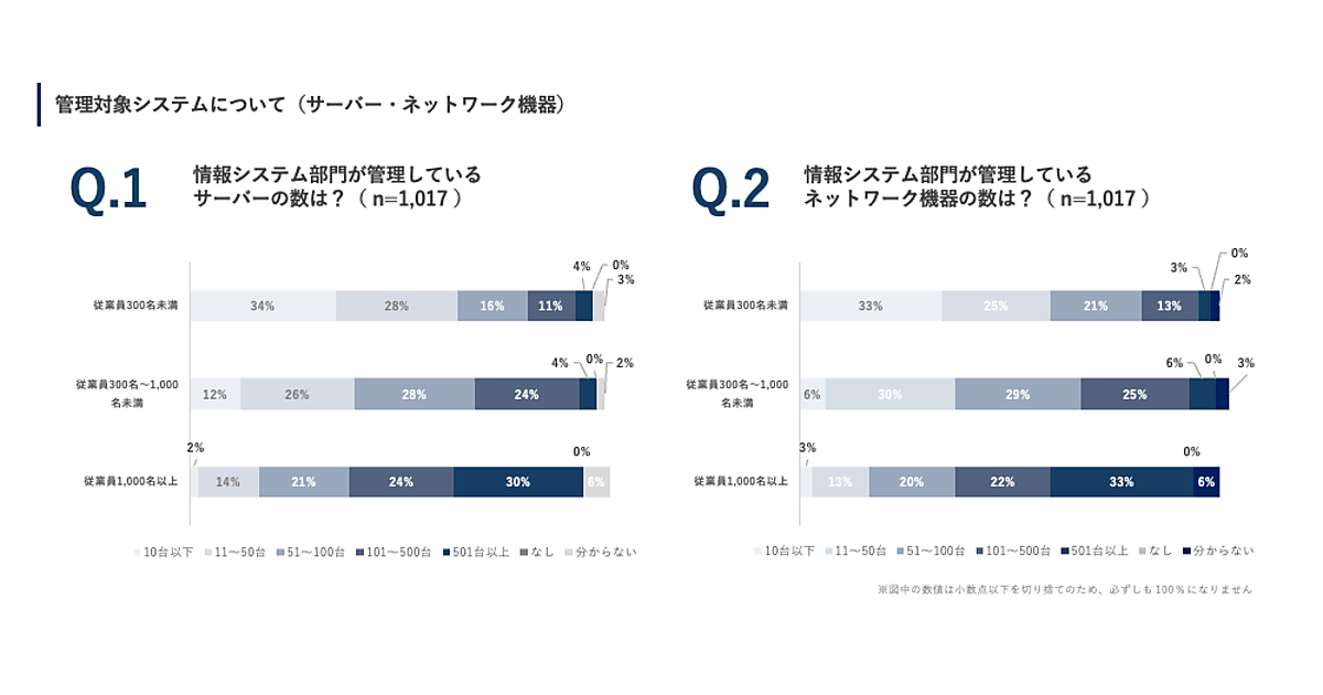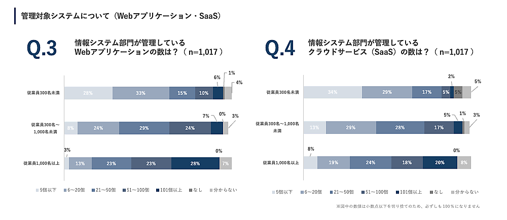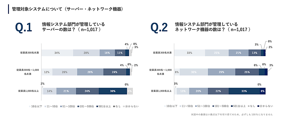 まず「情報システム部門が管理している対象システム(サーバー、ネットワーク機器、Webアプリケーション・SaaS)の数」を聞くと、従業員規模が大きくなるほど管理数も比例して増加。従業員数1,000名以上の企業では、500台を超えるハードウェア機器を管理している企業が3割以上を占めた。
