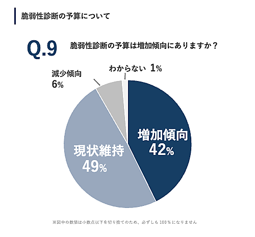 また「診断にかける予算」についても、「現状維持」49%が半数を占めるが「増加傾向」42%がそれに続く。