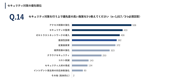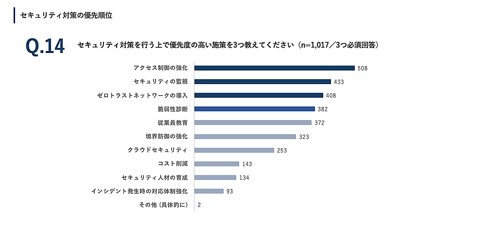 「セキュリティ対策を行う上で優先度の高い施策(3つを選択)」という質問に対しては、「アクセス制御の強化」508票が最多で、以下「セキュリティの監視」433票、「ゼロトラストネットワークの導入」408票が上位。