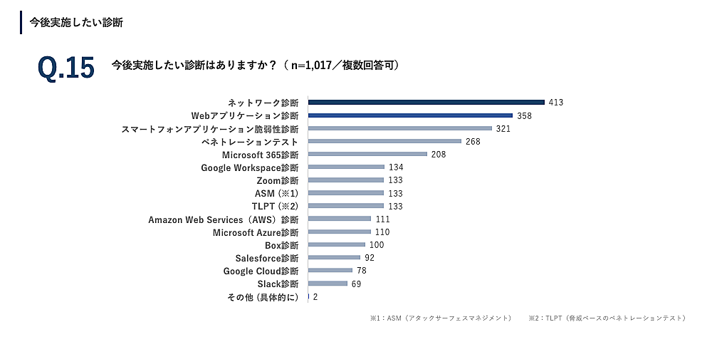 「今後実施したい施策(複数回答可)」では、「ネットワーク診断」413票が最多で、以下「Webアプリケーション診断」358票、「スマートフォンアプリケーション診断」358票が上位となった。ランサムウェアの侵入対策として「ネットワーク診断」は非常に有効と言えるとMOTEXでは指摘している。