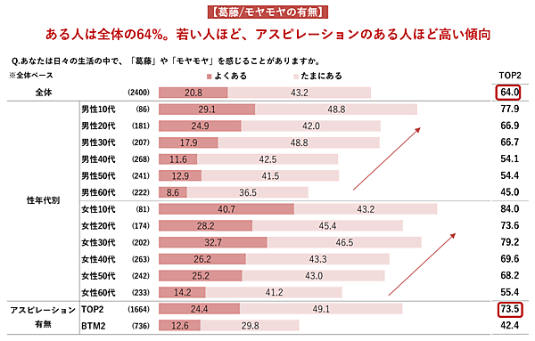 続いて、生活の中で「葛藤」や「モヤモヤ」を感じることがあるかを聞くと、64.0%が「ある」と回答。年齢が若くなるにつれ、葛藤がある人の割合は高くなる傾向が見られた。アスピレーションの有無別で見ると、アスピレーションを持っている人の方が「葛藤」している割合が圧倒的に多かった。